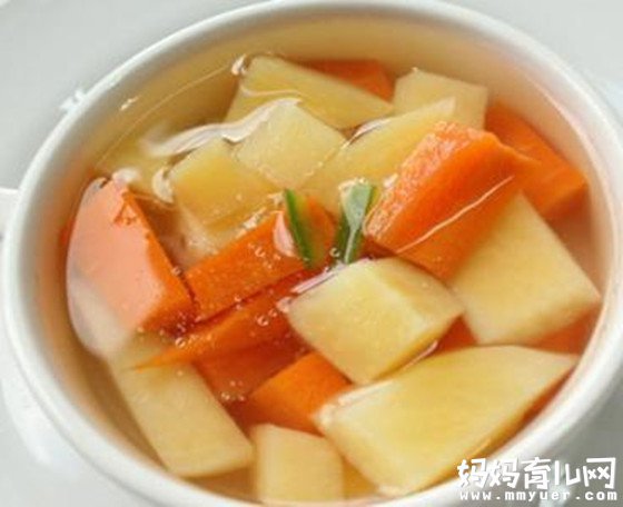 如果宝宝不喜欢吃苹果泥的话,也可用半个苹果和一小结胡萝卜一同榨汁给宝宝喝。胡萝卜中的果酸有助于宝宝的大便成形,另外需要指出的是胡萝卜最好先煮熟之后在进行榨,这样更有利于止泻,同 时也能起到补水的作用。