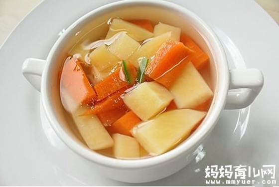 胡萝卜汤:取新鲜胡萝卜250克,洗净,连皮切成小块,放入锅中加水煮熟后,喝汤、吃胡萝卜。