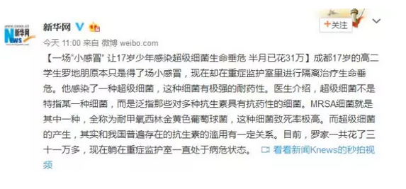 说起感冒谁不知道,提及感冒谁没患过。可是,就是这么常见的一场“感冒”,让成都一位17岁少年差点就命丧黄泉。当然,让这孩子病危、导致入院半月就花费高达31万之多费用的祸首,并非是真正的感冒。而是与感冒症状相似,很容易误判当成感冒治疗的一种超级细菌。