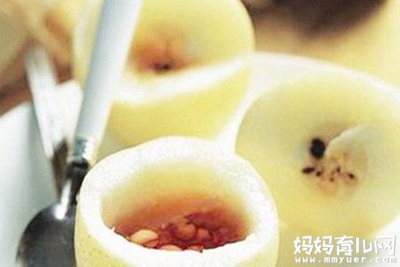 梨洗净,靠柄部横断切开,挖去中间核后,放入2-3粒冰糖,5-6粒的川贝,川贝要敲碎成末,把梨上部拼对好,也可用牙签插紧,放入碗中,上锅蒸30分钟左右即可,分2次给孩子吃,此方有润肺、止咳、化痰的作用,是一个非常普及的治疗风热咳嗽的食疗方,