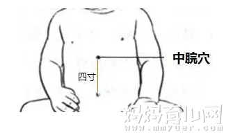 中脘穴位于胸骨下端与肚脐线中点(肚脐直上4寸)
