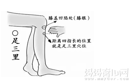 足三里在小腿前外侧,外膝盖窝当下3寸,距胫骨前缘一横指(中指),左右各一穴。