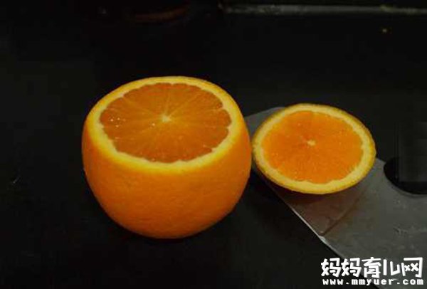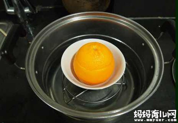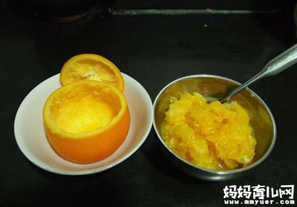 4、把蒸好的橙子水和果肉一起给宝宝吃(如果孩子太小,无法吃果肉,就把果肉压烂,挤出水份);
