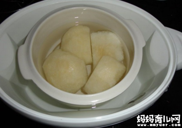 2.炖锅内加水放入切好的贡梨