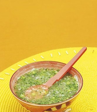 原料:西蓝花1~2朵、洋葱一片、鲜姜一片、蔬菜汤2大勺。