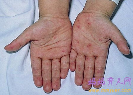 3、口腔疱疹后1~2天可在患儿的手心、足心及小屁屁上看到皮肤斑丘疹,以脚心部最多,疱疹呈圆形或椭圆形扁平小至米粒,大至豌豆大,较硬并内有混浊液体疱疹周围绕以红晕。