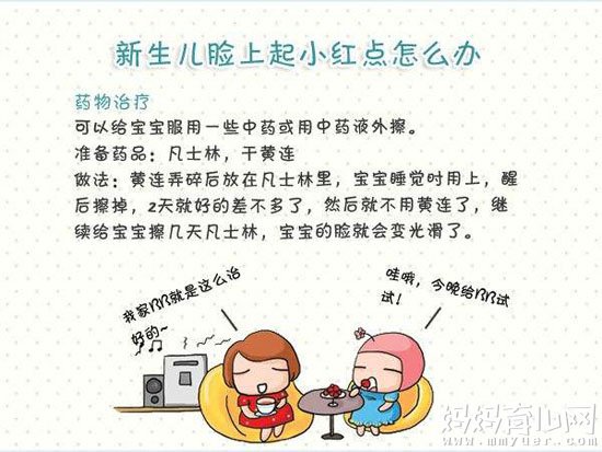 药物治疗:可以给宝宝服用一些中药或用中药液外擦。可以尝试去药店买些凡士林,干黄连;把黄连弄碎后放在凡士林里,宝宝睡觉的时候给宝宝用上,宝宝醒后给宝宝擦掉,2天就好的差不多了,然后就不用黄连了,继续给宝宝擦几天凡士林,宝宝的脸就会变光滑了。