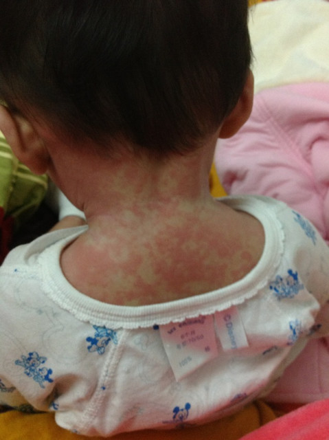高烧退了之后,就会出现皮疹,压之可褪色的斑疹或斑丘疹,其先发生于颈部和躯干,并蔓延到面部和四肢,另外有时皮疹可呈水疱状。一般情况下皮疹无瘙痒症状。皮疹通常持续1-2日,但有时可在2-4小时内短暂出现后随即消失。对于接受抗生素治疗的患儿,随后出现的皮疹常被误以为是药物过敏。
