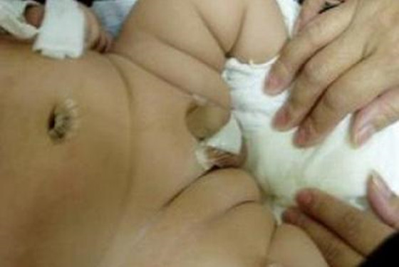 2、通常在小孩哭闹、剧烈运动、大便干结时,在腹股沟处会有一突起块状肿物,有时会延伸至阴囊或阴唇部位,在平躺或用手按压时会自行消失。
