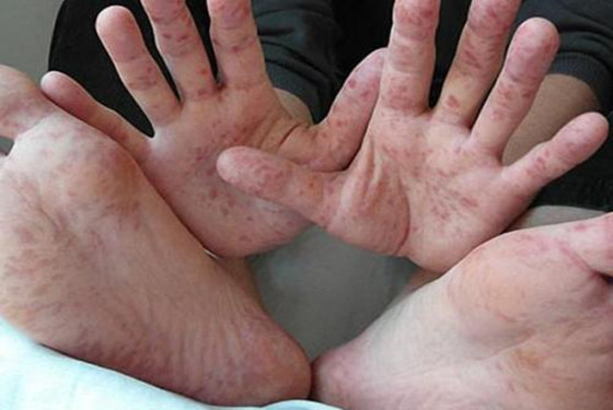 1)、急性起病,潜伏期3-5天,有低热、全身不适、腹痛等前驱症。口腔粘膜出现散在疼痛性粟粒至绿豆大小水疱,手、足出现斑丘疹、疱疹,初起为斑丘疹,后转变为疱疹,圆形或椭圆形,约3-7mm如米粒大小。
