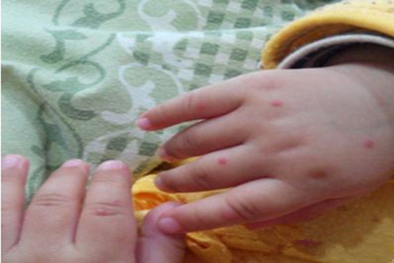 如果你仔细观察,会发现宝宝的手、足、口、腿、臀等部位会出现类似疱疹的一粒粒的小点点。