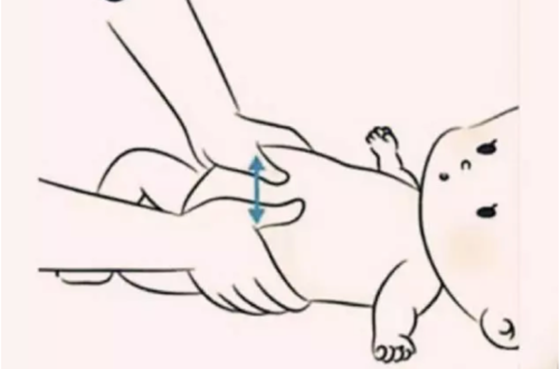 第三步:妈妈的手在宝宝上腹部做顺时针画半圆动作,两只手轮流着做,左手画左半圆,右手画右半圆;