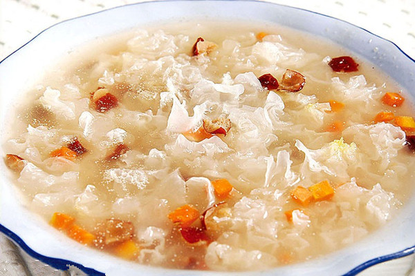 将红枣去核以及银耳泡发备用;再将红枣放入锅中煮10分钟加入泡好的银耳以及冰糖小火慢煮,煮成浓稠状即可起锅,起锅前可加入适量的枸杞,味道更佳。疗程为半个月,每天喝一次。