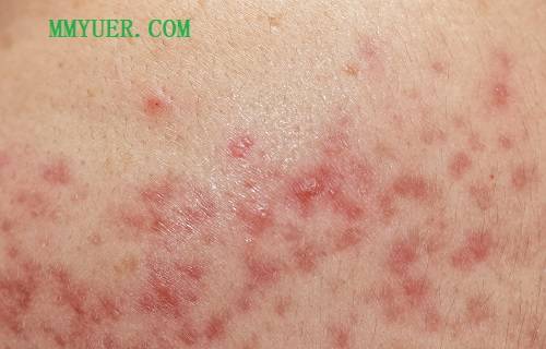 6、丘疹性荨麻疹:易发于暴露部位,表现为梭形或纺锤形的风团样红斑、瘙痒。