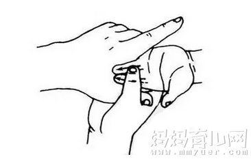 使孩子掌心向上,一手握住孩子的中指,使孩子无名指、食指暴露于前,宝妈用另一手的拇指或中指由孩子无名指和食指指根向指尖同时直推300次。(温馨提示:速度要轻快,一气呵成)
