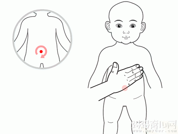 四指放置小儿腹部,以肚脐为中心顺时针摩腹。(建议先给宝宝热敷一下腹部再做摩腹)