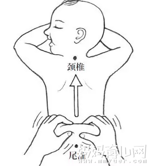 让孩子俯卧、背部裸露,涂抹适量的润肤介质(爽身粉),用双手的中指、无名指、小指握成半拳状,食指半屈,拇指伸直对准食指前半段,然后顶住孩子皮肤,拇、食前移,提拿皮肉、同时向上捻动,自尾椎两旁(即脊柱两侧)双手交替向前推自大椎(脖后突出部位)两旁。