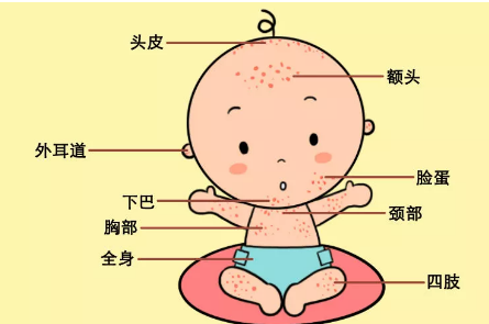 通常情况下,湿疹会以宝宝的小脸蛋为首发根据地,逐渐蔓延至额头、下巴、头皮、颈部、胸部、四肢、外耳道乃至全身。