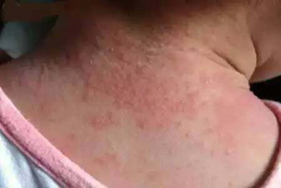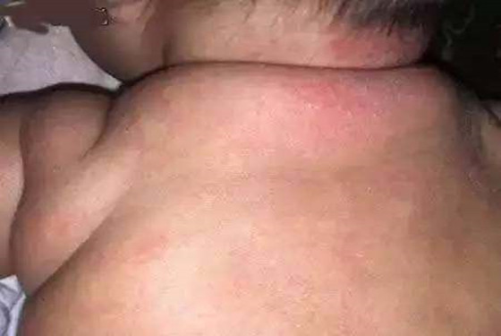 热疹(痱子),它们是凸出皮肤表面的,摸上去有颗粒感。一般是夏季最多见,它们会长于宝宝的胸前、额头、脖子上、腋窝下、背上、屁股上、肢体关节折皱处。症状为红红的一片,很明显能看出有粒粒小疹子,