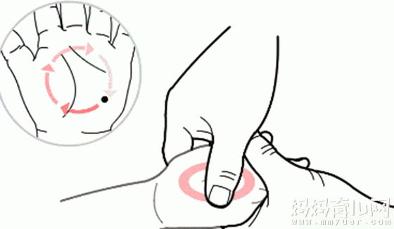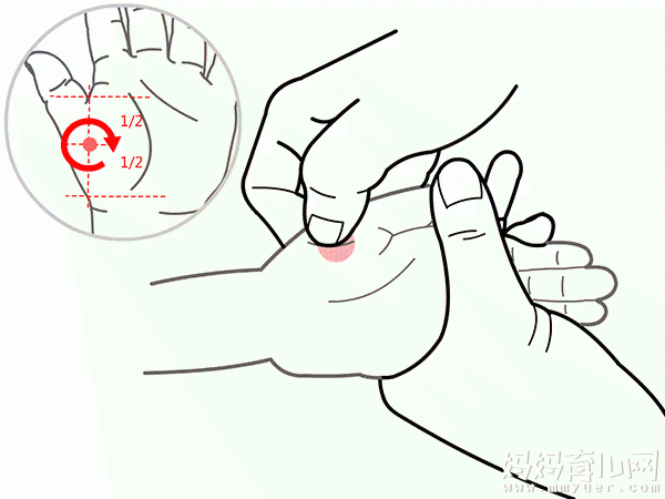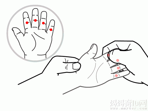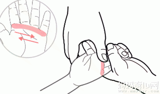 用一只手托住孩子的手掌,暴露桡侧缘,然后用另一只手的拇指螺纹面从孩子手掌虎口推向食指指尖。