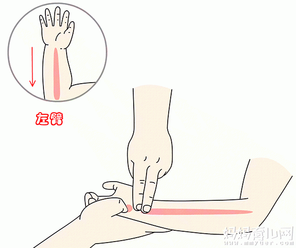 用一只手握住孩子的手腕,使其掌心向上,然后用中指、食指指腹自孩子腕横纹推向肘横纹直推,推的方向一定是从腕到肘,不可反向操作!