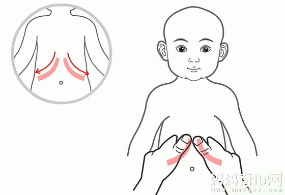 用双手拇指自剑突下分别沿肋弓下缘或中脘到脐,向两旁分推。