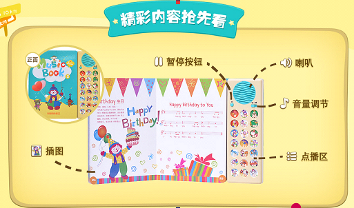 铛铛铛铛……,正是大家期待已久的金宝贝音乐3!其特点广而周知,就是会唱歌的音乐书,小宝宝们只要按下按键,便可聆听到美妙悦耳的歌声,每一首都经过深思熟虑,每一曲都经历了反复的海选,只为让每一位宝宝都能够感受到最原汁原味的英文歌曲,让宝宝从音乐中获得美感和快乐!
