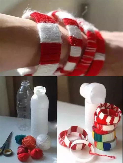 方法:将塑料瓶剪成合适宽度的塑料环,用毛线缠绕,直至完全覆盖住内环。年龄稍大的孩子可以学习系绳,注意在一开始时提醒幼儿留出线头。不会系绳的孩子可以用胶棒固定。