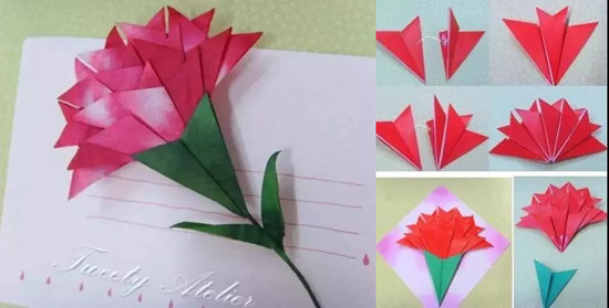 方法:花朵部分的制作方法如下,完成后可按自己的意愿添加花茎,然后用双面胶粘贴在贺卡底板上,并写下祝福的话语。