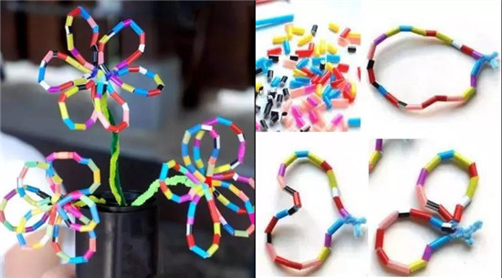 方法:如图先将吸管剪碎穿在毛根上,每根毛根可以扭成两个花瓣,组合花瓣进行造型时需要老师稍作指导。最后可以让幼儿自由发挥,添加叶子,装饰花瓶等。