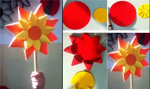 方法:可以将幼儿分成3-4人一组,给每组准备碗、杯子、瓶子等物品,帮助幼儿自己探索圆的画法。在分剪圆时,注意提醒幼儿中间不要剪断。最后老师可以帮忙用胶枪固定筷子。
