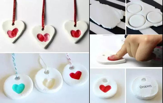方法:先将纸黏土压平,用杯子刻出所需的圆饼。用吸管在上方的位置打出一个小洞,方面最后穿丝带。然后将幼儿手印印在中间,成心形或其他形状。待纸黏土风干后,可以在背面或边缘稍作装饰。
