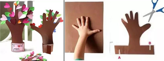 方法:先请幼儿观察图片或实物,共同讨论制作方法盒注意事项,然后分组完成。重点在于手掌的印画和剪刀的使用,可以引导幼儿探索一次剪出多个心形树叶的方法。