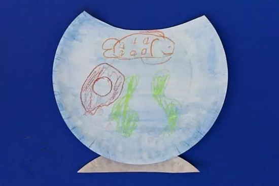 这个可以用班上幼儿的作品进行制作,还可以给孩子上一节手工课!用蜡笔和水彩颜料来实现即可。用剪刀剪下鱼缸口子,用剪下来的部分分作为鱼缸底座,超简单的手工。
