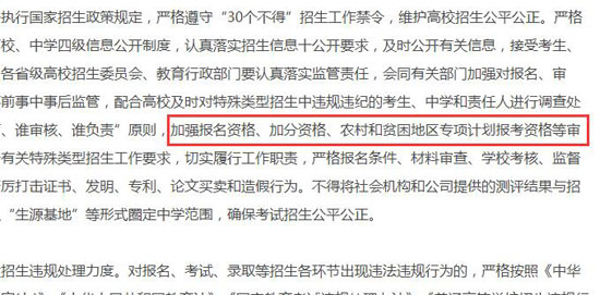 同一天,在国家教育部发布的《关于做好2018年普通高校招生工作的通知》里明确提到“各地各校要严格执行国家招生政策规定,严格遵守“30个不得”招生工作禁令,维护高校招生公平公正。严格执行国家、省级、高校、中学四级信息公开制度,认真落实招生信息十公开要求,及时公开有关信息,接受考生、学校和社会的监督。”