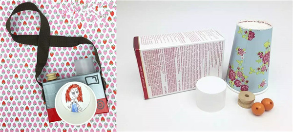 准备材料:一个小号纸板包装盒、纸杯、一个塑料瓶盖、小木塞、小珠子、缎带、绳子、胶带、记号笔