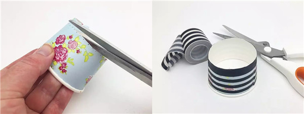 制作步骤:用彩色胶带美化纸盒外表面,当然也可以用锡箔纸或颜料。找一个纸杯,从中间裁开。