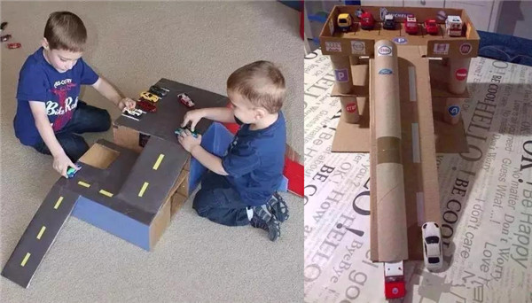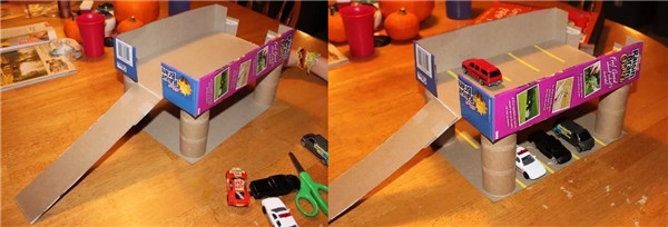 把 4 个卷纸筒粘在纸盒下面的四个角上,如果想要更牢固,可以在中间位置再加一个纸筒。车库一层用一张纸板代替即可,粘在卷纸筒上。最后再加一个坡道就可以了!