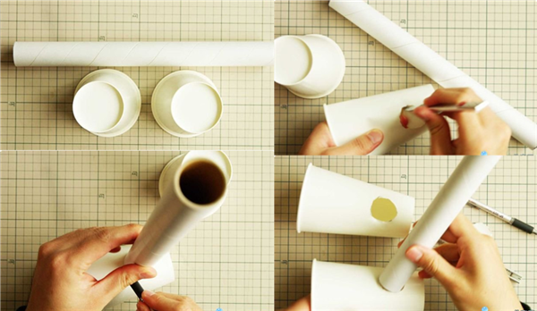 两个纸杯、一个圆纸筒(细长),将细长的直筒放在纸杯侧面,用笔围着纸筒画一个圈,打上记号。用小刀把圆圈去掉,变成一个洞,记住,两个纸杯的洞口相对,纸杯的方向要一致,两个洞刻好之后把细长直筒插在两个洞里。