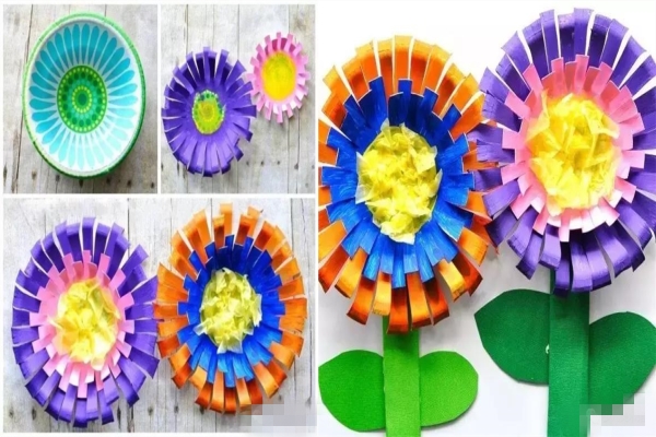 先将一大一小的一次性蛋糕盘子涂上颜料,风干之后剪成花瓣状,消脂肪要在大纸盘内粘贴好。中间再沾上一点碎纸片,任何颜色都可以,但是黄色的碎纸会更显色。再用绿色的卡纸做好花干就可以啦~