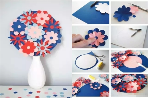 贺卡的第一印象就是方方正正的?No,圆形的花朵和卡是不是和特别有创意呢?现在不同颜色的卡纸上画好许多大小不一的花瓣,然后剪下来。