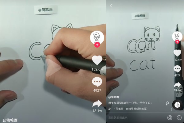 这个英文简笔画的创作者就是直接用一些英语单词或者数字等等画的简笔画,他的抖音账号就叫“简笔画”,利用一个简单的英语单词cat,就可以用寥寥的几笔勾画一只小猫咪出来,下面我们来看看cat英文是怎么变成小猫的吧: