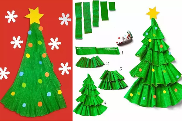 3.一根一根的交叉固定,在底端折起来粘好,在顶端留一个小方块,然后在底端粘上棕色的卡纸作为圣诞树的树干,接着再把准备好的装饰物,毛毛球、彩色圆片等进行粘贴装饰就行了。