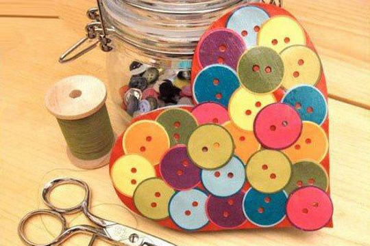 3.最后用胶水将这些彩色的纽扣们都粘贴在刚刚剪下来的爱心形状上,然后可以在背面写上自己的新年新年祝福语。