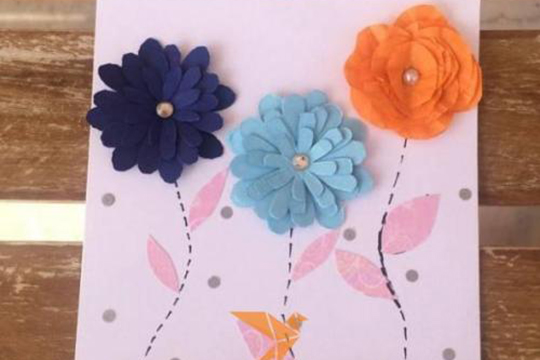 5.最后将大小不同的圆形花瓣按照顺序叠放在一起,可以一个颜色叠放,也可以三个颜色组合,然后在中间贴一个闪闪亮的水钻或者珍珠,随后在进行装饰,粘贴叶子和画枝干等。