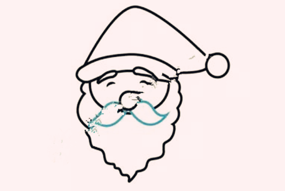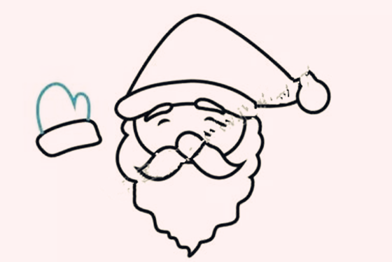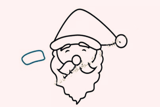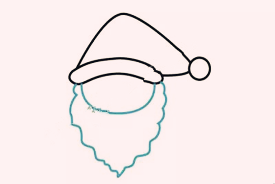 第三步:用笔勾画出圣诞老人的脸部、胡须的轮廓,脸的大小要根据圣诞帽的帽顶来画,脸和胡须的轮廓在帽顶大小以内。