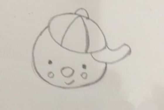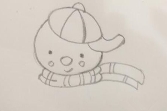 2、画头部:在帽子下方画出雪人的头部,圆圆的、大大的头,可以稍微画得大一点夸张一点的。