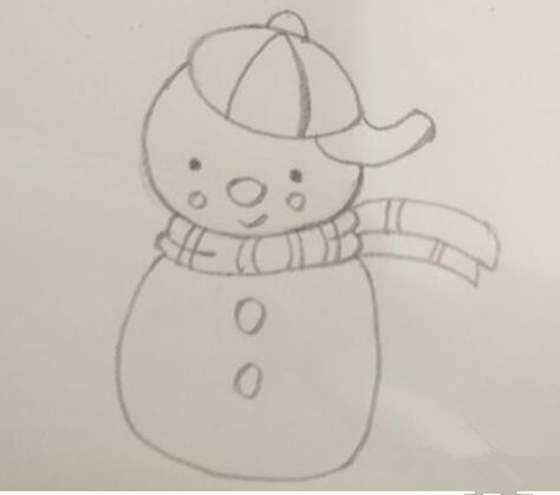 4、画围巾:雪人头部以上画好后,我们再来画它的围巾,一条长长的围绕脖子的漂亮围巾。