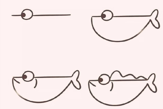 这款小长鱼很常见,简单的两条线就完成了它的身子,然后是尾巴用线连起来,接着是画出鱼的头部和眼睛,再画出鱼鳍。