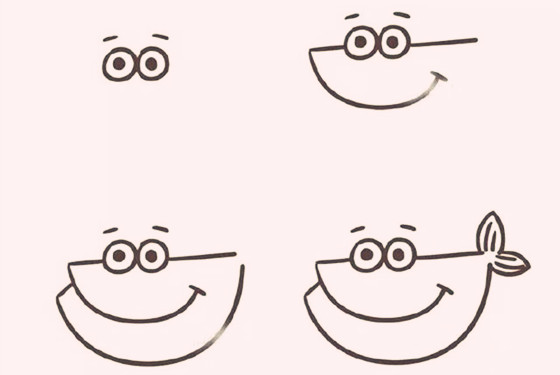 这款鱼的画法很简单,共分四个步骤就可以完成,先画出眼睛和整体轮廓,再补画出鱼身和尾巴,然后再做勾画就完成了。